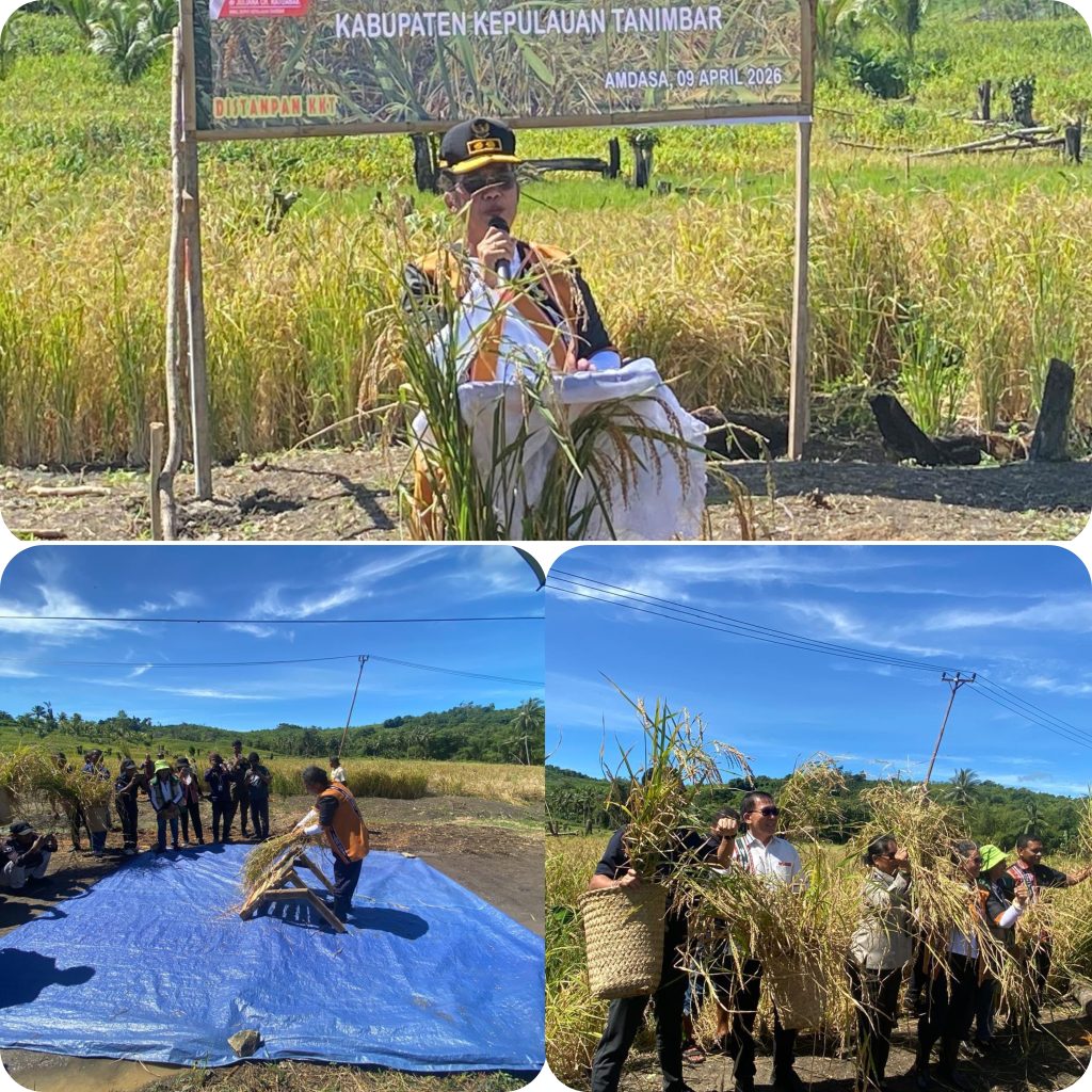Saumlaki.wartatanimbar.com – Polda Maluku, Kepolisian Resor Kepulauan Tanimbar, Kapolsek Wertamrian, Ipda Kurniawan Dwi Sandi, menghadiri Panen Raya Padi pada Lahan Kering yang dilaksanakan oleh Kelompok Tani “Bulatan” di Jalan Trans Yamdena, Desa Amdasa, Kecamatan Wertamrian, Kabupaten Kepulauan Tanimbar, Kamis (09/04/26).