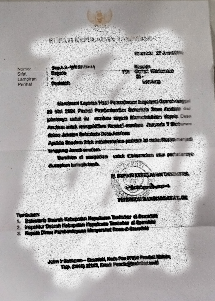 wartatanimbar.com – Saumlaki. Kepala Desa Amdasa, B B. diduga tidak mengindahkan Perintah Bupati Kepulauan Tanimbar hal ini terungkap ketika terjadi persoalan di Desa Amdasa, Kecamatan Wertamrian, Kabupaten Kepulauan Tanimbar terkait pemberhentian Sekretaris Desa Amdasa JTS sejak bulan Januari tahun 2024 lalu. Pasalnya Kades Amdasa ketika memberhentikan Sekdes Amdasa itu dianggap tidak sesuai prosedur dan tidak sesuai aturan perundang-undangan yang berlaku.