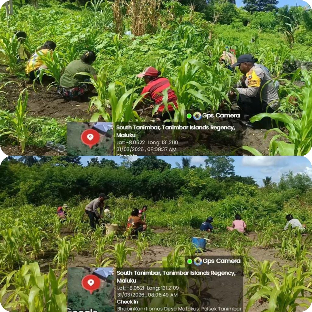 Saumlaki.wartatanimbar.com – Polda Maluku, Kepolisian Resor Kepulauan Tanimbar, Guna mendukung program Ketahanan Pangan Nasional, Personel Bhabinkamtibmas Desa Matakus, Bripka Brian Christoffel kembali hadir di tengah Masyarakat untuk melaksanakan kegiatan pembersihan sekaligus pemantauan lahan tanaman jagung hibrida di Desa Matakus, Selasa (31/03/26).